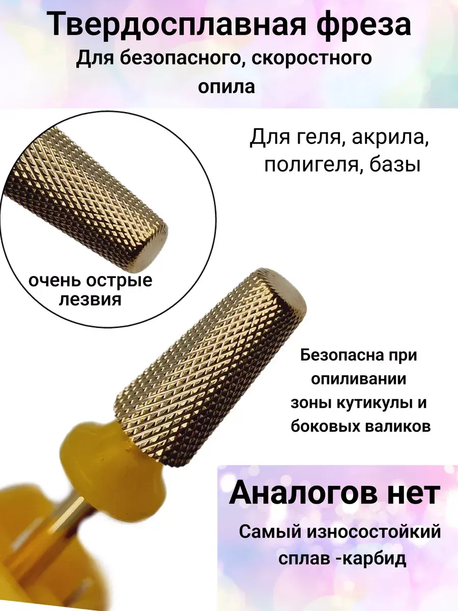 Фреза тв для снятия покрытия, маникюра и педикюра твердосплавная универсальная. Формы: кукуруза, елочка, торнадо, елка, усеченный конус, безопасная для снятия и коррекции. Высококачественные фрезы износостойкого сплава - карбид очень острые , служат долго, не забиваются в отличие от керамических фрез и не нагреваются , что делает процедуру безопасной для клиента. Твердосплав применяется в аппаратном маникюре и педикюре для: для коррекции длины и формы ногтя, снятия полимеров - акрил, гель, гель лак, биогель, акригель, полигель, выпиливания линии улыбки, удаления отслоек, части ногтевой пластины, работы с натуральным утолщенным ногтем, обработки старых натоптышей, грубой кожи, кератозных ногтей. Рекомендуемая скорость вращения 5-25 тыс. об/мин. Безопасная фреза закругленный конус не повреждает ноготь, с ее помощью материал снимать быстро и легк, идеальна для коррекции, выпиливания арки . Для мягкого удаления плотного птеригия и как завершающая финишная обработка синусов. Подлежит химической стерилизации и дезинфекции. Абразив: средний синяя, грубый зеленая, фиолетовая насечка. Подходит для аппаратов STRONG, Marathon, RuNail, TNL, Irisk и аналогов. Маникюрная фреза маленький конус очень острая, будте аккуратны , работайте на маленьких оборотах. Фрезы тонкие для выпиливания ногтя и затеков в зоне кутикулы и боковых валиках , рекомендуем ими работать в положении ,,лежа,, и на высоких оборотах, так как твердосплав фреза тонкая. Фрезы конус используйте так же на высоких оборотах. С помощью зажима на микромоторе насадки можно фиксировать на удобную вам длину.