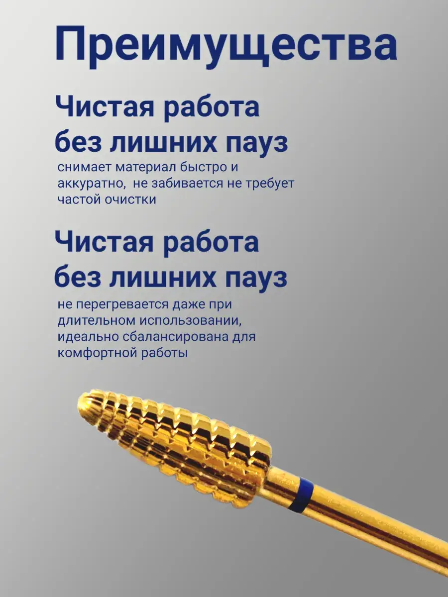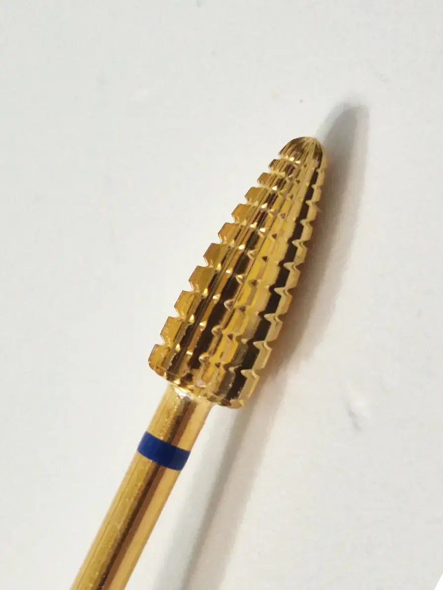 Твердосплавная фреза кукуруза с синей насечкой в аппаратном маникюре применяется для быстрого снятия гель-лака (при наличии достаточного опыта работы) и плотного покрытия (акрил, гель, полигель, акрилатик), изменения длины искусственных ногтей, коррекции и формирования внутренней арки нарощенных ногтей (выпиливание большого объёма материала под ногтем).