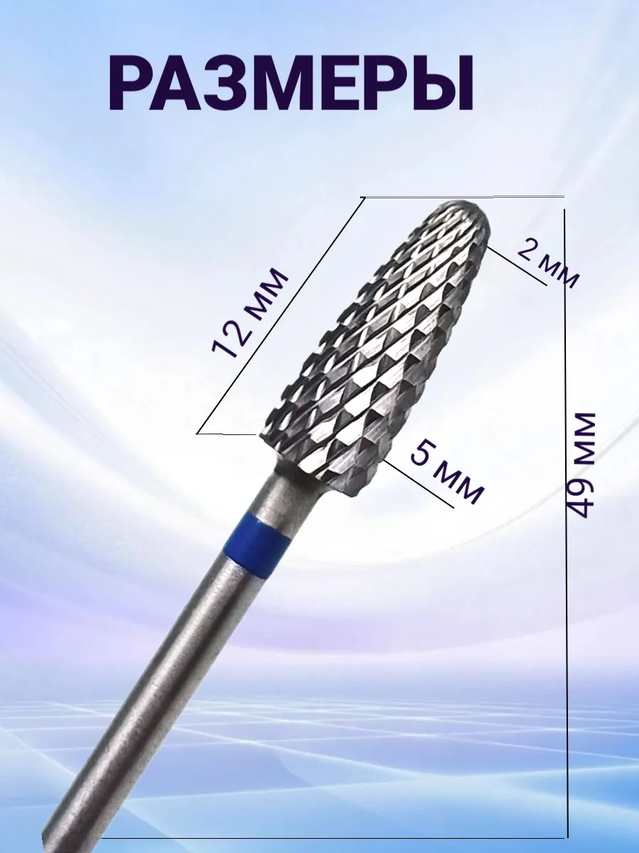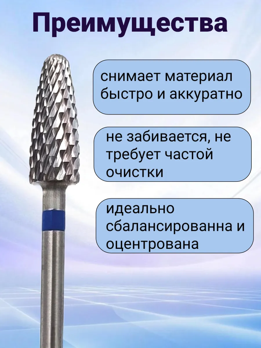Твердосплавная фреза кукуруза с синей маркировкой в аппаратном маникюре применяется для быстрого снятия гель-лака (при наличии достаточного опыта работы) и плотного покрытия ( гель, полигель, акрилатик), изменения длины искусственных ногтей, коррекции и формирования внутренней арки нарощенных ногтей (выпиливание большого объёма материала под ногтем).