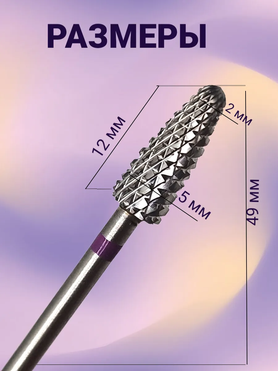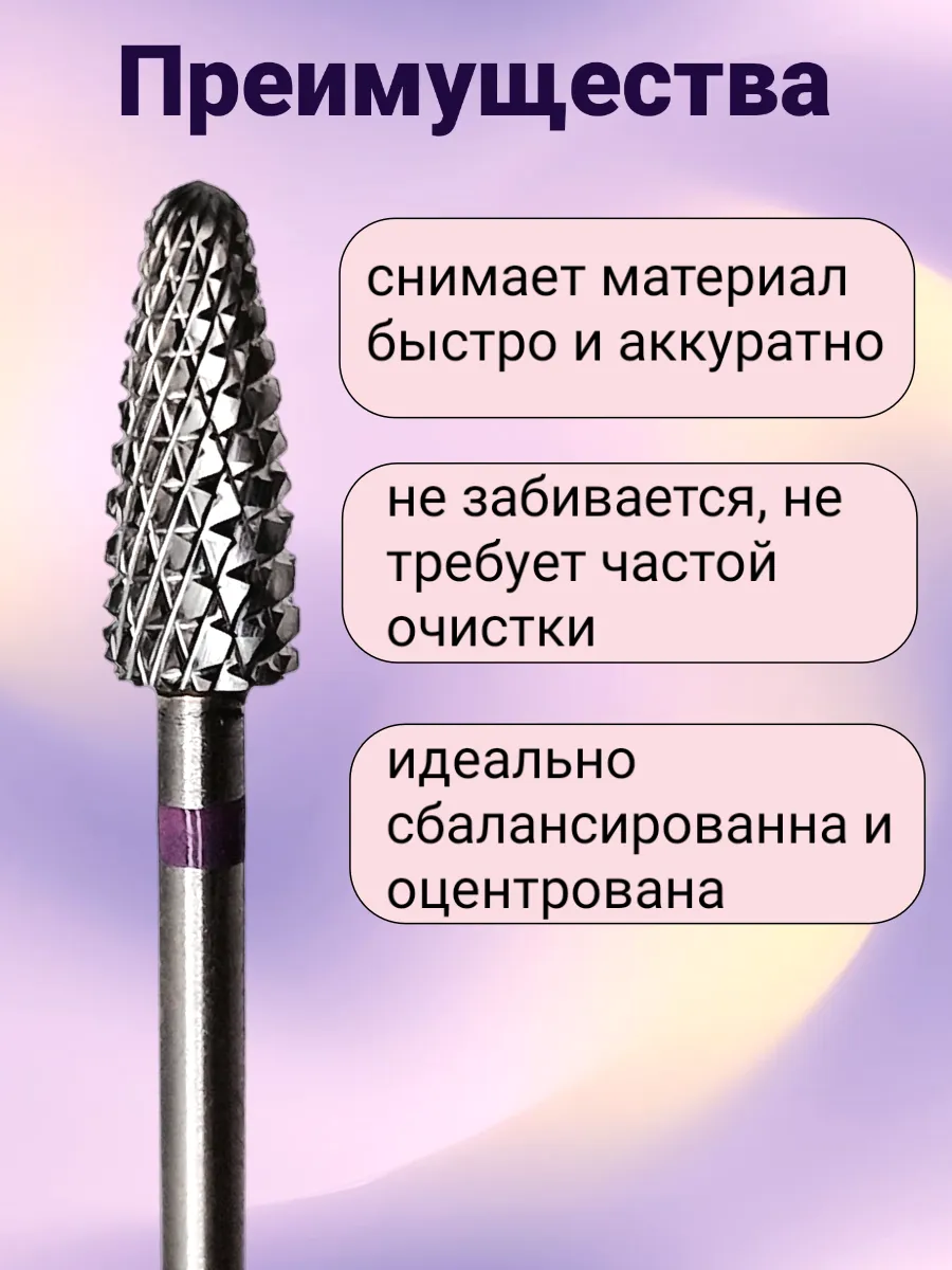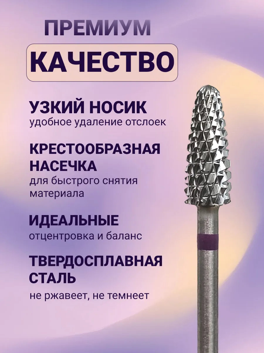 Твердосплавная фреза кукуруза с фиолетовой маркировкой в аппаратном маникюре применяется для быстрого снятия гель-лака (при наличии достаточного опыта работы) и плотного покрытия (акрил, гель, полигель, акрилатик), изменения длины искусственных ногтей, коррекции и формирования внутренней арки нарощенных ногтей (выпиливание большого объёма материала под ногтем).