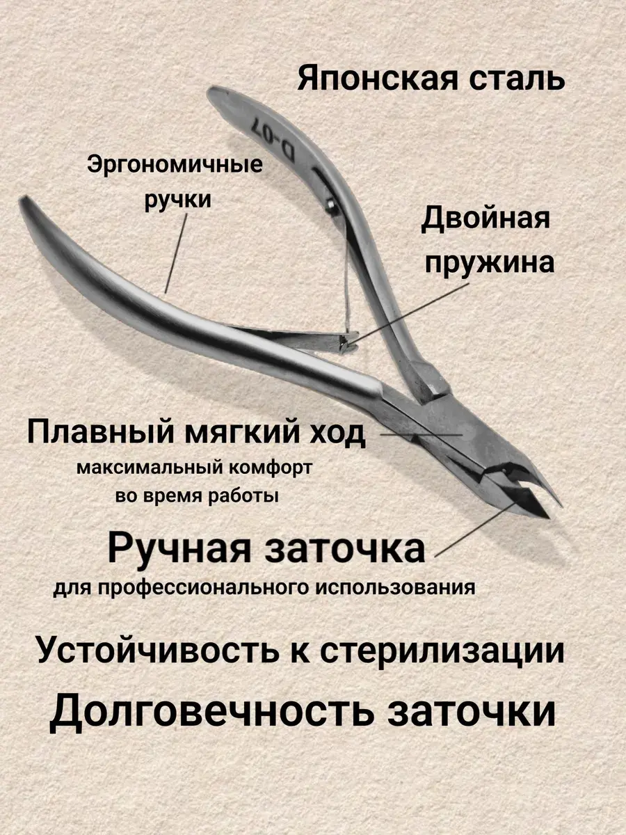 Аккуратно удаляют кутикулу и обеспечивают точный ровный срез. Режущие полотна при сыкании не имеют просветов, щелей изазубрин. Благодаря форме ручек, инструмент удобно держать в руке. Рука не устает. Кусачки заточены вручную, что гарантирует остроту лезвий, отрегулированный плавный ровный ход без провалов и идеальное схождение режущих поверхностей. При правильном использовании не допускают образования повреждений и ранок.