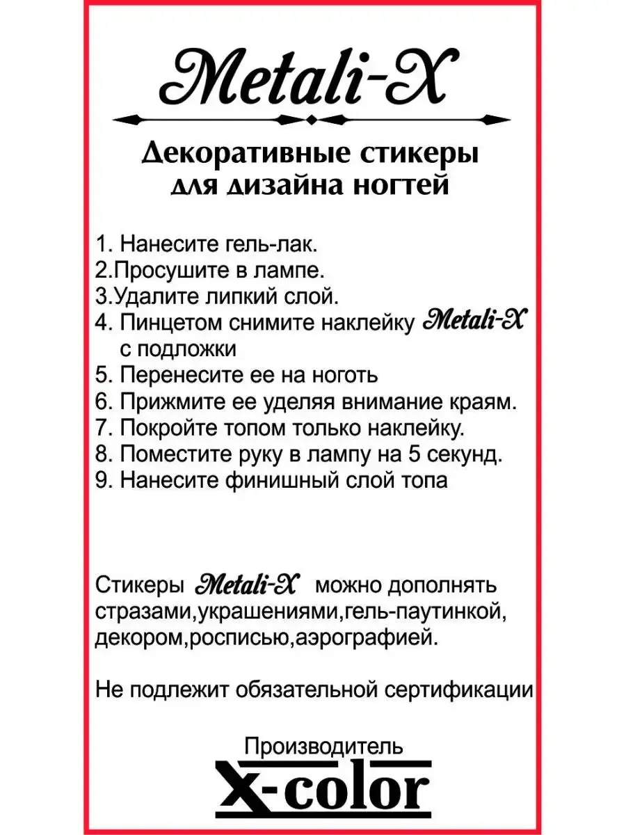 Наклейки для ногтей Metali-x. Невероятное количество рисунков , тонкая и одновременно прочная подложка, которая не порвется, позволяет сделать модный дизайн маникюра легко и просто. Слайдер или простыми словами наклейки маникюрные экономят много времени и сил. Стикер - это самоклеящаяся наклейка с вырезанным рисунком. Применяются при наращивании гелем, акрилом, покрытием гель-лаком. Способ применения: подготовьте ногти, нанесите цветное покрытие, Обязательно удалите липкий слой ,пинцетом снимите элемент , прижмите ее, уделяя внимание краям, покройте топом только слайдер, просушите в лампе 5 сек., нанесите финишный слой топа, просушите. С помощью слайдеров для украшения ,можно создавать абсолютно любой декор, добавлять для украшения маникюра- гель-паутинку ,хлопья юкки, слюду, стразы сваровски, фольгу, битое стекло дизайн, блестки, лепку , омбре , китайскую роспись.