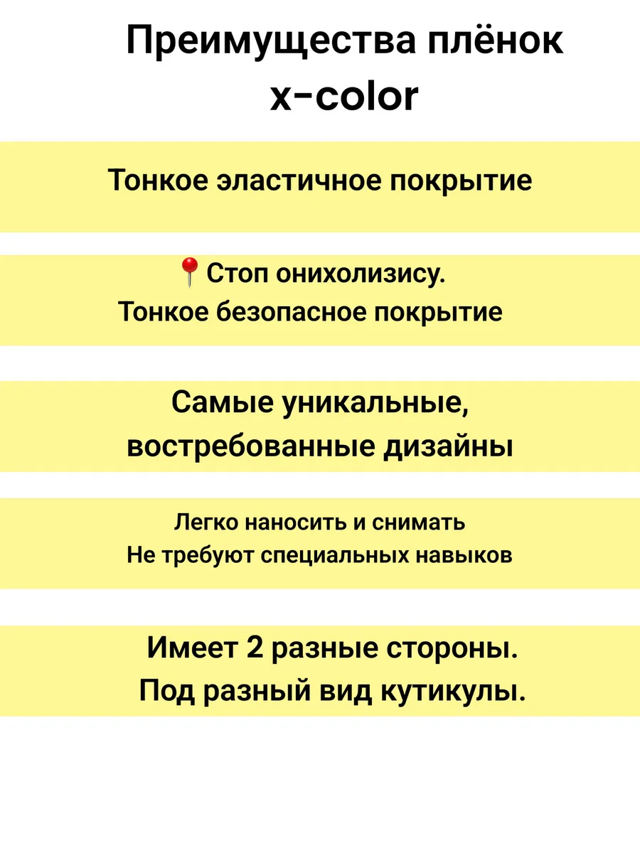 Отличная клеевая основа позволит носить плёнки до следующего визита к мастеру, не зависимо от того, чем её покрыть лаком или гель лаком.Для удобства на упаковке есть QR коды с мастер классами, а так же четко прописанная инструкция по применению. Подойдут для мастеров различного уровня и удовлетворят потребности самого капризного клиента, а вам подарят незабываемые впечатления от лёгкости в применении!